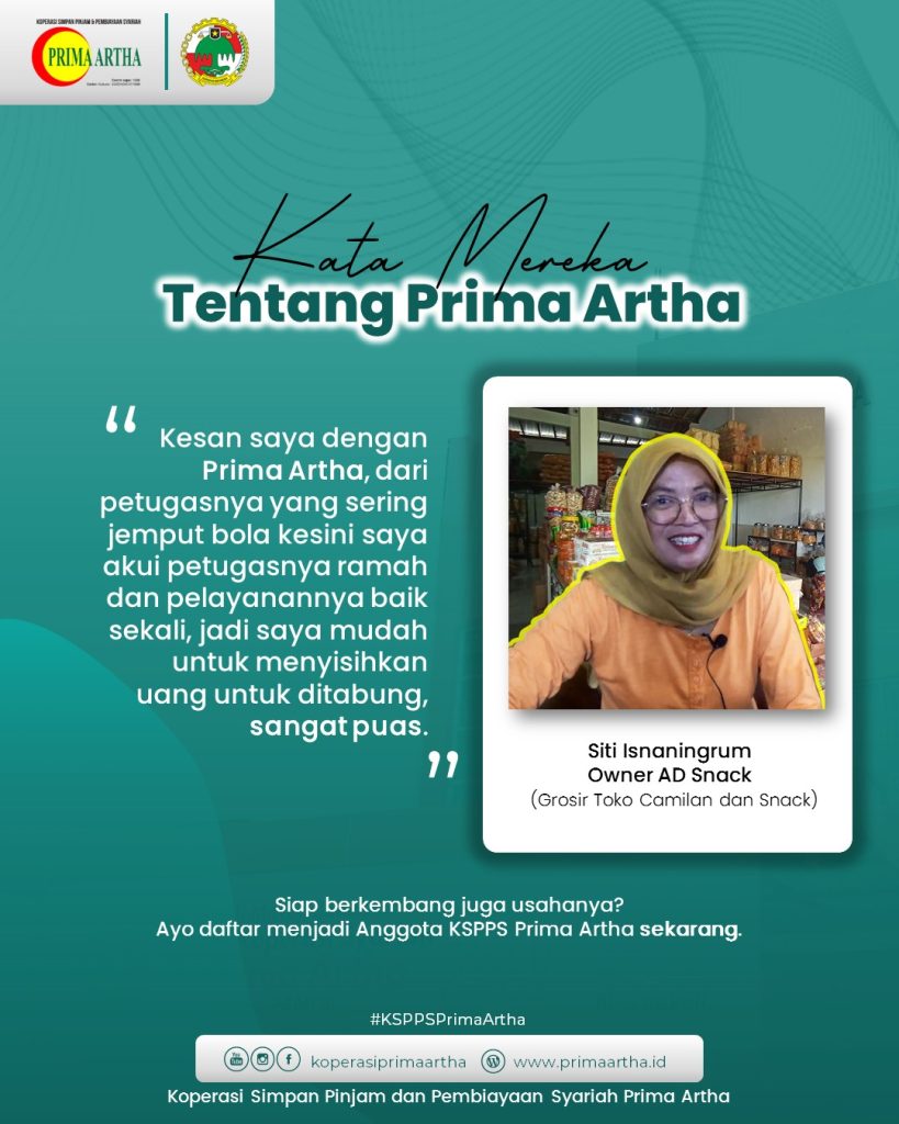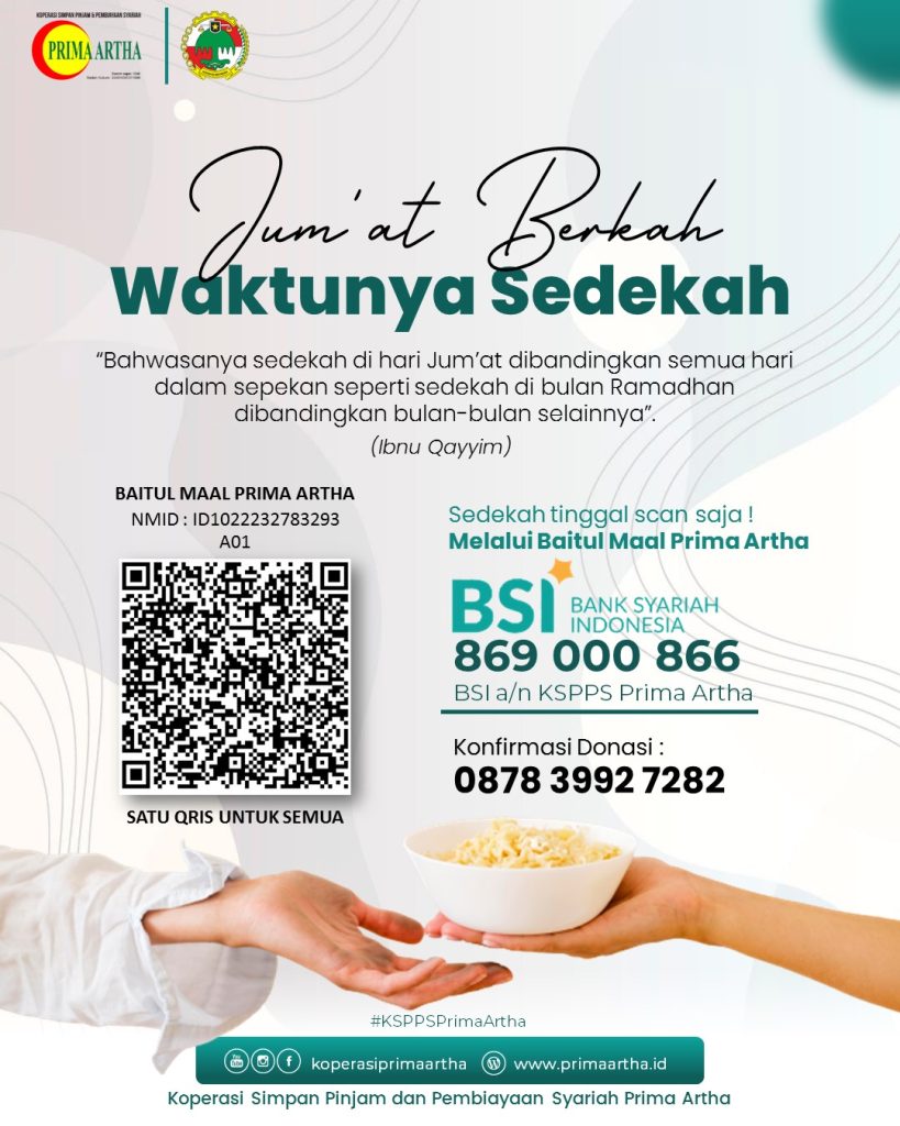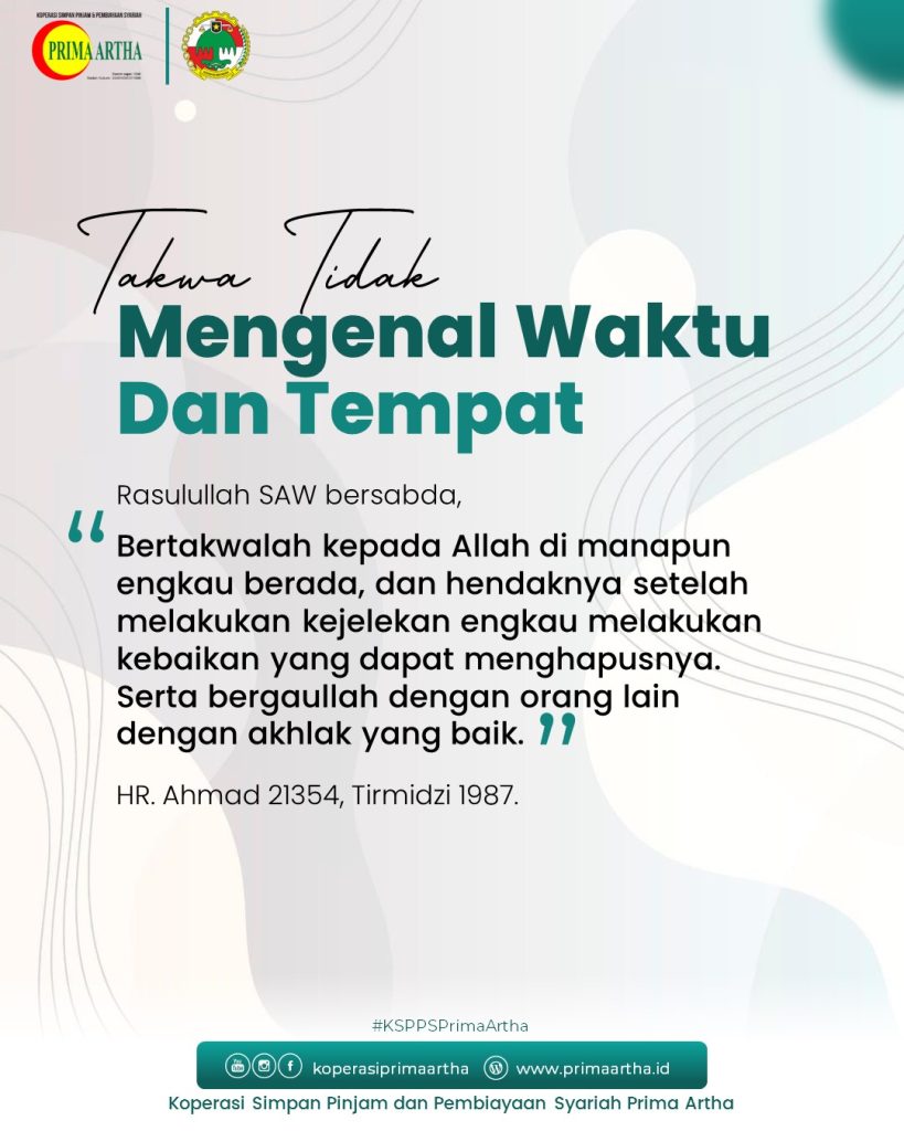 Rasulullah SAW bersabda, “Bertakwalah kepada Allah di manapun engkau berada, dan hendaknya setelah melakukan kejelekan engkau melakukan kebaikan yang dapat menghapusnya. Serta bergaulah dengan orang lain dengan akhlak yang baik.” HR. Ahmad 21354, Tirmidzi 1987. Follow @koperasiprimaartha KSPPS Prima Artha, Kemitraan untuk tumbuh bersama. Kantor Sleman : Jl. Dr. Radjimin No. 40 C Paten, Tridadi, Sleman, …