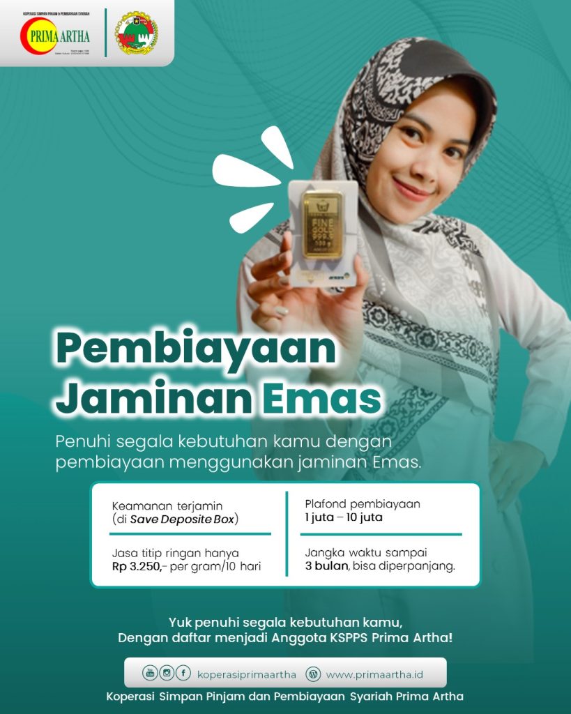 Buat kamu yang sedang butuh dana darurat dengan agunan emas, bisa pengajuan di KSPPS Prima Artha, dengan Jaminan Emas. Jasa titip emas hanya 3.250/gram per 10 hari . Bisa pakai emas batangan atau emas perhiasan. Syarat cukup KTP dan emas beserta kwitansi pembelian. Plafond pembiayaan 1 juta – 10 juta, jangka waktu 3 bulan bisa …