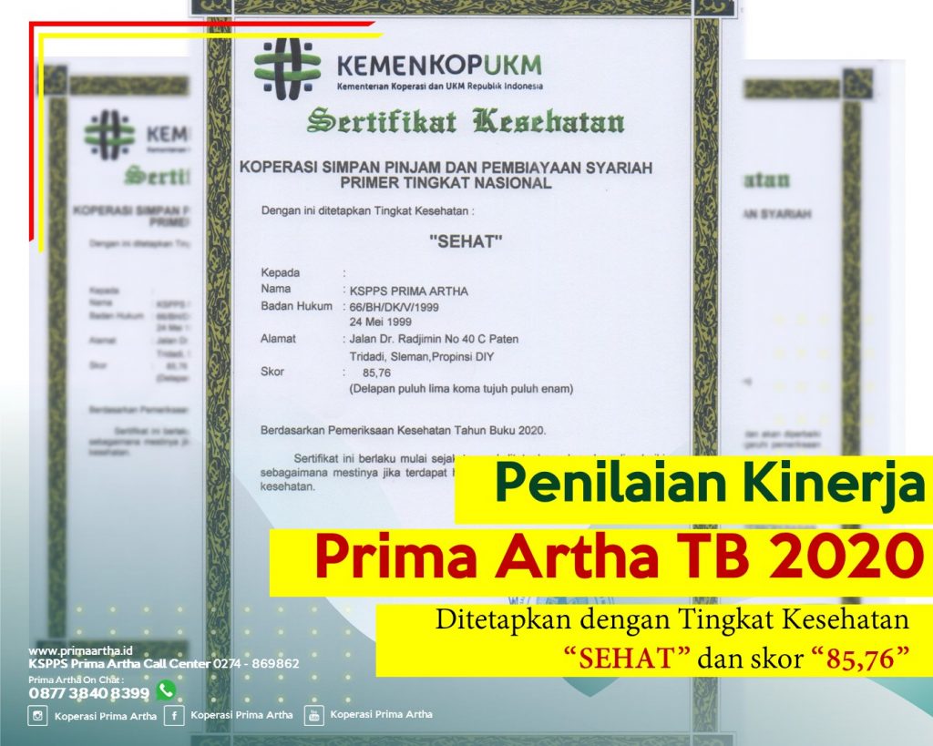 Sleman, 14 Desember 2021. KSPPS Prima Artha catatkan kinerja tahun buku 2020 dengan tingkat kesehatan “SEHAT” dan Skor 85,76. Catatan Kinerja ini berdasarkan Pemeriksaan Kesehatan oleh Kementerian Koperasi dan UKM RI pada tahun 2021. Di tengah Pandemi Covid – 19, KSPPS Prima Artha selalu berupaya untuk Progresif dalam mengembangkan usahanya . Inovasi – inovasi secara internal dan produk untuk anggota selalu dikembangkan untuk memenuhi tantangan – tantang eksternal yang berkembang.