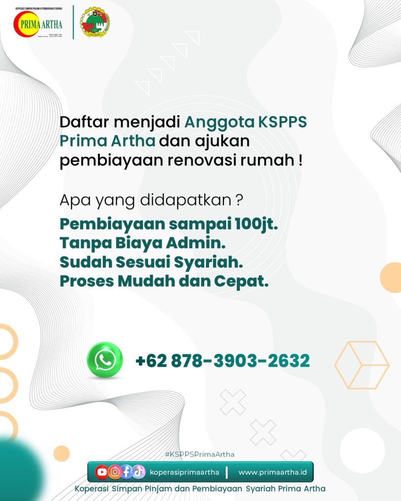 Sedang renovasi rumah dan dana kurang?Berita / Maret 27, 2023 Maret 27, 2023 Selamat pagi Sobat Prima Artha,Anda sedang merenovasi rumah?Tapi dananya masih kurang?Perlu tambahan dana lagi?Ajukan Pembiayaan di KSPPS Prima Artha untuk renovasi rumah impianmu.– Sudah sesuai dengan syariah– Tanpa biaya Admin– Proses CepatKSPPS Prima Artha,Kemitraan untuk tumbuh bersama.Kantor Sleman : Jl. Dr. Radjimin No. 40 C paten,tridadi, sleman, slemanKantor Seyegan : Jl. Kebon Agung, Kasuran,Margiomulyo, Seyegan, Sleman